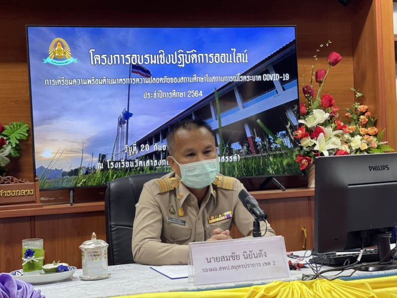 วันจันทร์ที่ 20 กันยายน 2564 เวลา 09.00 น. - 12.00 น. นายสมชัย นิยันตัง รองผู้อำนวยการสำนักงานเขตพื้นที่การศึกษาประถมศึกษาสมุทรปราการ เขต 2 เป็นประธานในพิธีเปิดโครงการอบรมเชิงปฏิบัติการออนไลน์การเตรียมความพร้อมมาตรการความปลอดภัยของสถานศึกษาในสถานการณ์โรคระบาด COVID-19 ณ โรงเรียนวัดเสาธงกลาง (พิทักษ์ประชาสรรค์)
