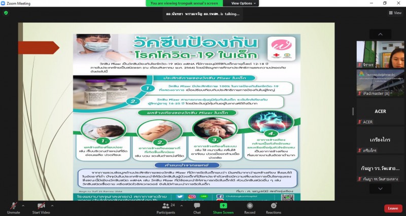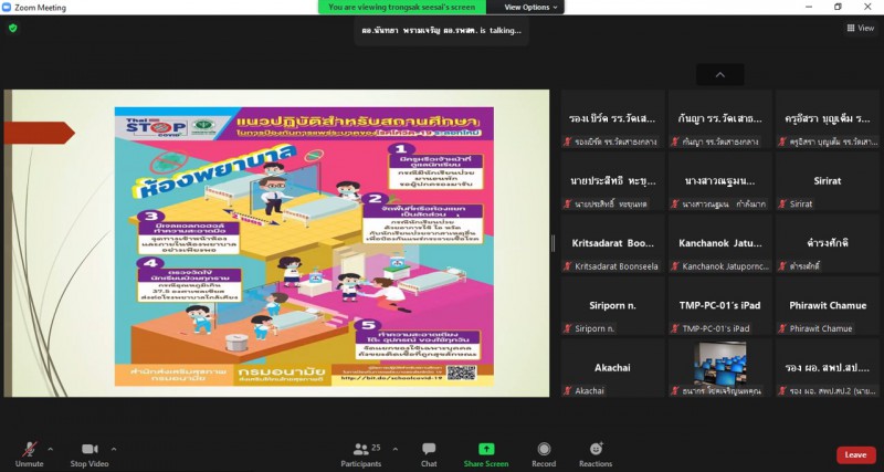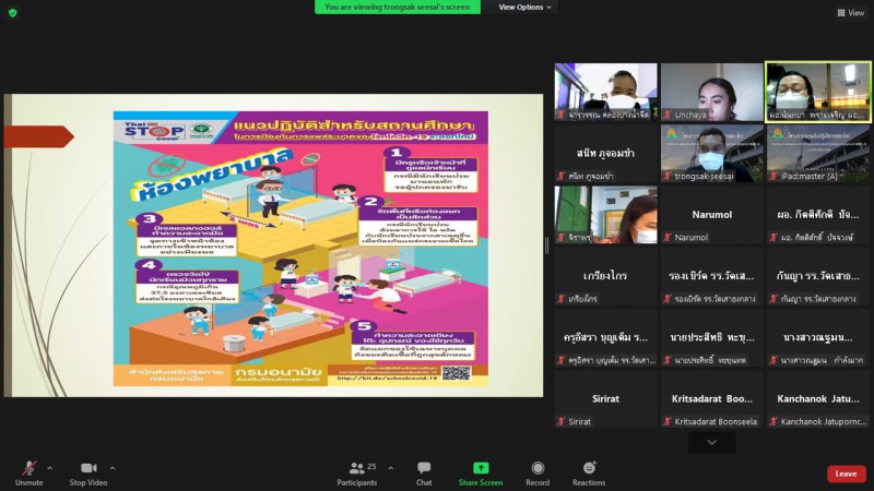 โดยมีนายกิตติศักดิ์ ปัจจวงษ์ ผู้อำนวยการโรงเรียนวัดเสาธงกลาง (พิทักษ์ประชาสรรค์) คณะครูและบุคลากรทางการศึกษาทุกท่าน ได้เข้าร่วมอบรมโครงการอบรมเชิงปฏิบัติการออนไลน์ในครั้งนี้ ซึ่งมีนางนันทยา พรามเจริญ ผู้อำนวยการโรงพยาบาลส่งเสริมสุขภาพตำบลเสาธงกลาง เป็นวิทยากร ให้ความรู้แนวทางมาตรการเตรียมความพร้อมความปลอดภัยของโรงเรียนวัดเสาธงกลาง (พิทักษ์ประชาสรรค์) ในช่วงสถานการณ์โรคระบาด COVID-19 |